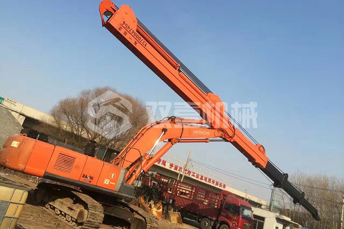 超長(zhǎng)四節(jié)臂:總長(zhǎng)度可達(dá)48米,臂內(nèi)可再伸出3節(jié),施工深度42.5米,配帶貝殼斗1.8立方或挖掘斗1.0立方。