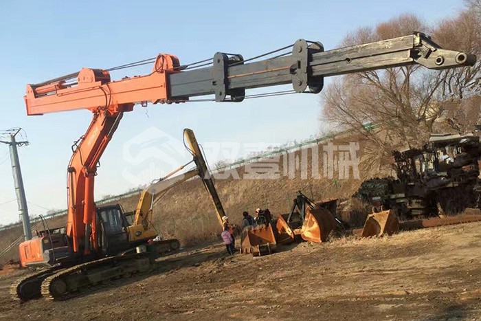 超長(zhǎng)四節(jié)臂:總長(zhǎng)度可達(dá)48米,臂內(nèi)可再伸出3節(jié),施工深度42.5米,配帶貝殼斗1.8立方或挖掘斗1.0立方。