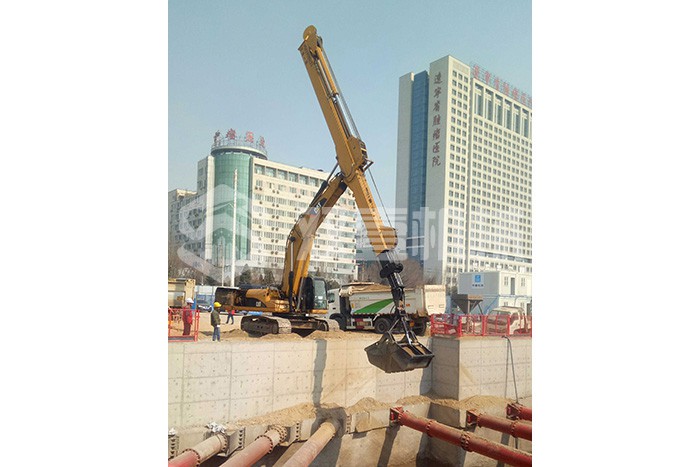 超長(zhǎng)四節(jié)臂:總長(zhǎng)度可達(dá)48米,臂內(nèi)可再伸出3節(jié),施工深度42.5米,配帶貝殼斗1.8立方或挖掘斗1.0立方。
